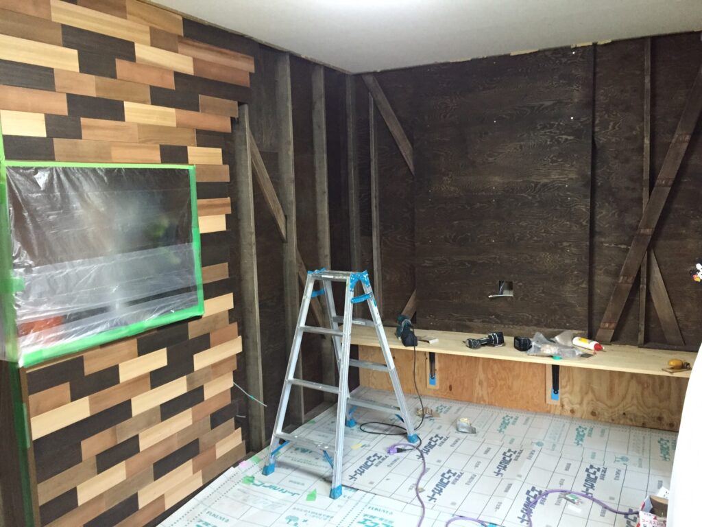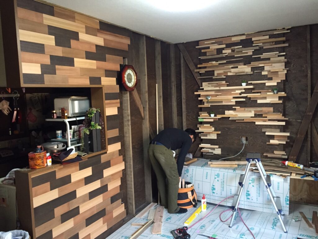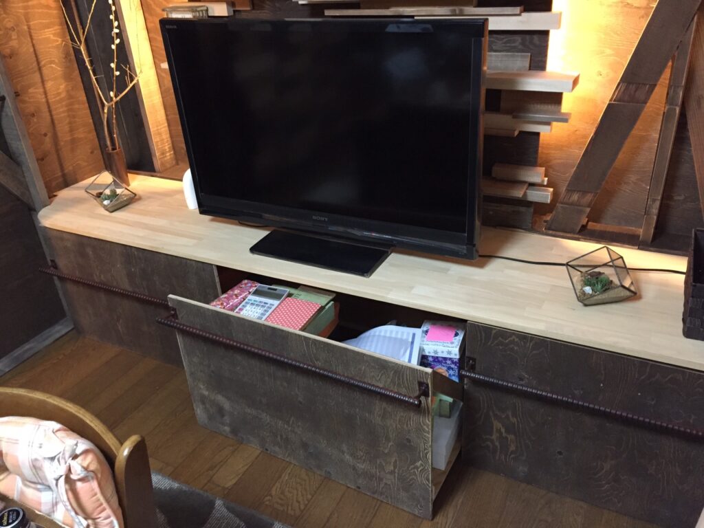 既存の間柱や筋違いを出して間柱と間柱の間にベニヤを貼って仕上げていきます。様々な色に塗った木材を平面的、立体的に貼っていきます。テレビの裏と壁の一部に照明を入れて、オシャレな空間を演出します。テレビ台の下は出し入れ出来る棚を作り、今までゴチャゴチャしていた物を収納できるように直しました。