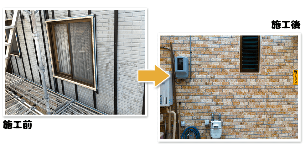 サイディングの劣化が進んでいて触ると手に粉がついてしまう。この場合早急な改修が求められます。今回は明るい雰囲気にしたいというご希望もあり、金属サイディングによるカバー工法を採用。完成後の窓枠も外壁と一体化して外観を損なわない仕上がりを実現。本物のタイルと見間違えてしまうほど、金属の塗装技術が高くなっいます。