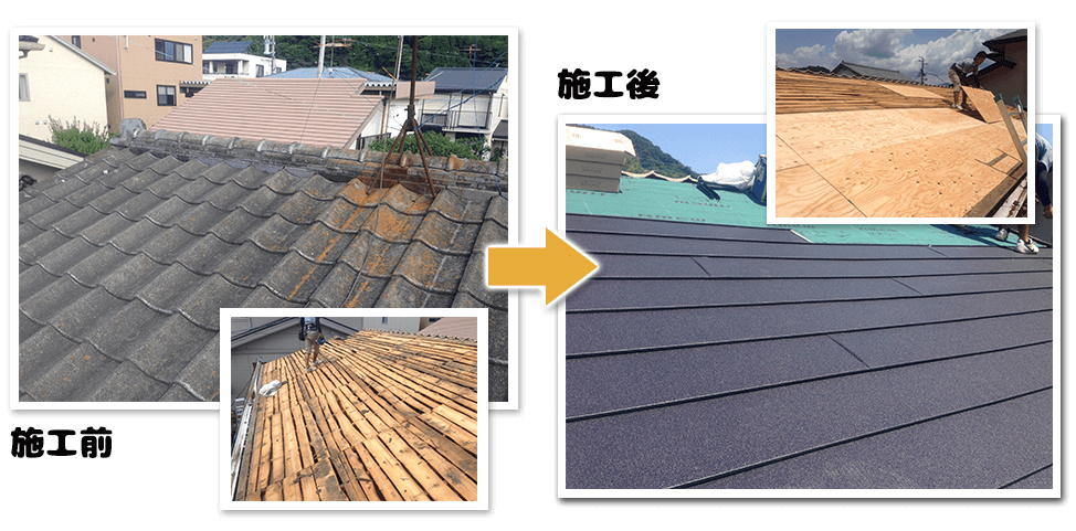 既存セメント瓦は45年経っているだけあって雨漏りも酷く瓦も割れている状態。改修を早急に行わないと家自体の駆体にも大きく影響します。45年前の屋根下地も雨水の侵入により腐食が進んでいました。そのため、古い屋根下地の上に新規屋根下地のラーチ合板を施工し、防水下地のルーフィングを施工。断熱ルーフは、断熱性能・遮音性・耐久力もグンと上がり、メンテナンス時期も大幅に伸びるためコストダウンにつながります。